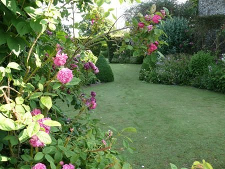 Composé de trois terrasses successives ponctuées d'ifs topiaires, un deuxième jardin s'ouvre sur une belle bordure de graminées, les plantes à fleurs bleues et les hémérocalles.